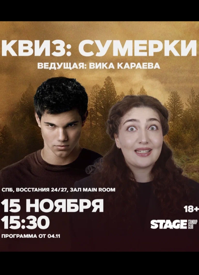 Это комедийная викторина, где ты сможешь попробовать свои силы и показать насколько разбираешься в киносаге! Квиз рассчитан на кругозор обычного человека, но где-то придётся подумать! Шоу рассчитано и на тех, кто любит Сумерки, и на тех, кто любит интересные вопросы, и на тех, кто любит просто попить пиво с друзьями.