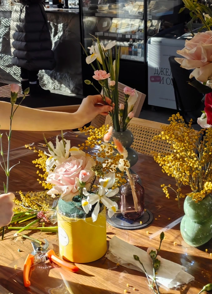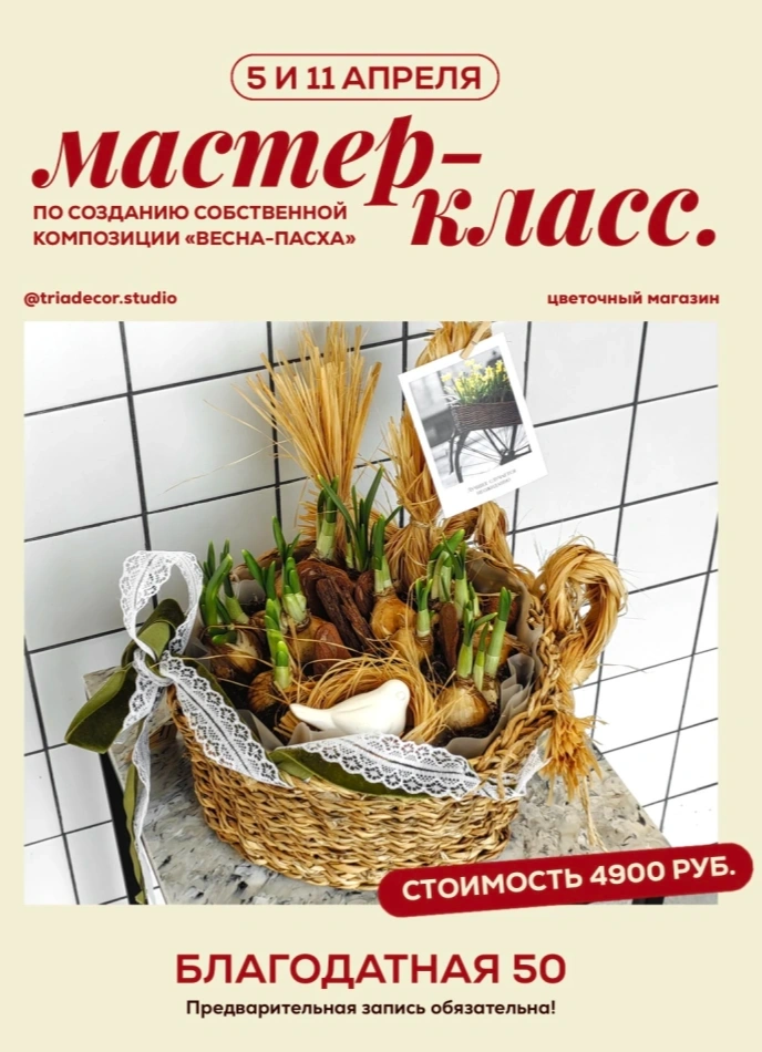 Прекрасная возможность собраться с подружками на уютном весеннем мастер-классе, поболтать, выпить ароматный кофе, и собрать роскошную композицию из свежих цветов, которая украсит твой дом и каждый день будет напоминать о том, что ты сделал(а) её с большой любовью своими руками.