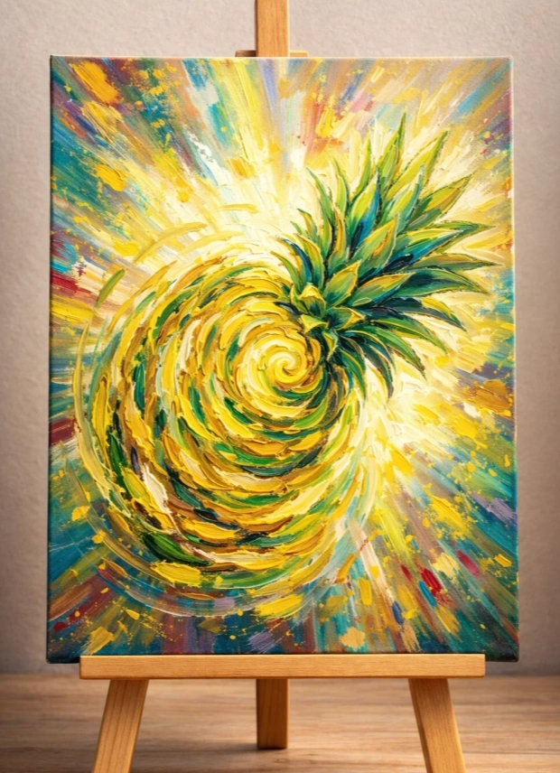 —Ананас — это вспышка щедрости вселенной. Его силуэт растворится в вихре света и мазков, напоминая: достаток — это энергия, которую ты готов впустить.
