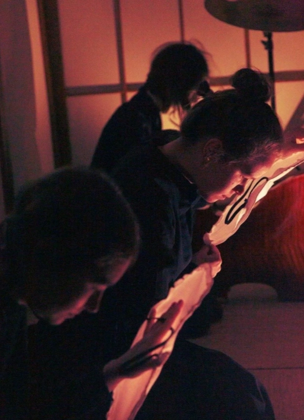 Спектакль — фантом, в котором каждый присутствующий, в воображении, собирает свой рисунок, без привычных связей и структур, где внутри аритмичного действия, музыкальных импровизаций и называния неназываемого на разных языках — определяются три строчки хайку, которые на несколько мгновений создают впечатление соединённых смыслов, и снова рассеиваются в пространстве и времени...
