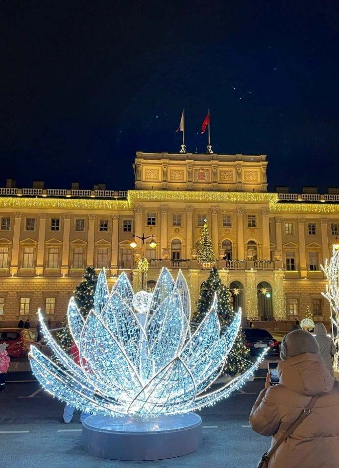 21:30 — Остановка у величественного Михайловского замка, окутанного предновогодней атмосферой