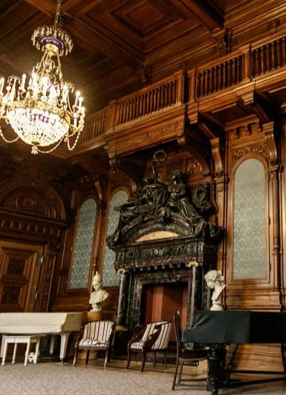 С парадной лестницы открываются главные залы: Белый, Бронзовый, Дубовый, зелёная гостиная, будуар с эркером. Высокие окна, зеркала, витражи, дубовая резьба, мрамор, бронза, шелк — всё подлинное, нетронутое временем.