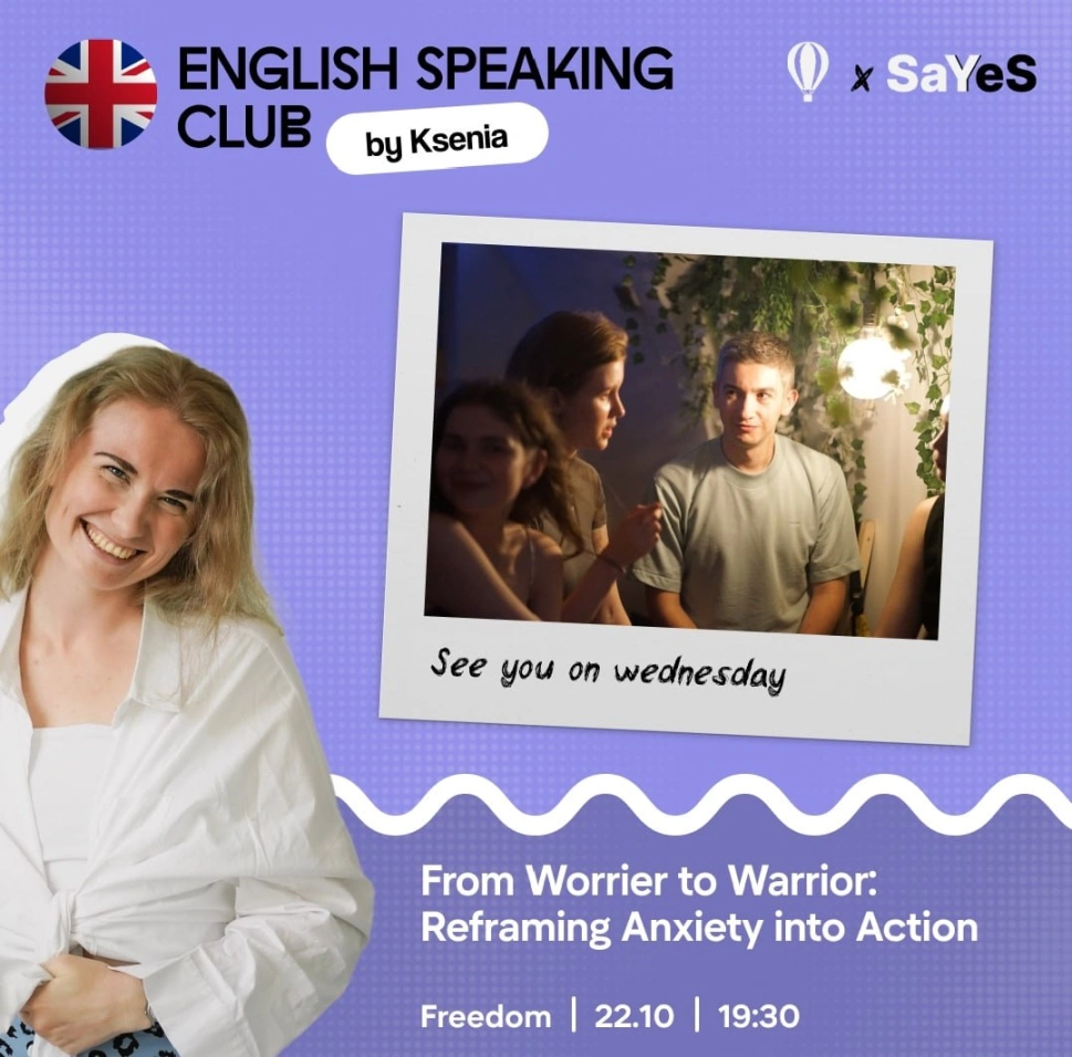Ведущая клуба — Ks'u'sha Anik'u'shina — создаст тёплую атмосферу, где легко делиться историями, обсуждать реальные ситуации и даже немного потренироваться в импровизации.