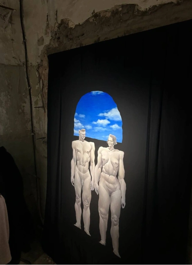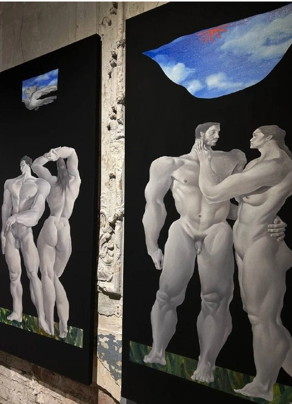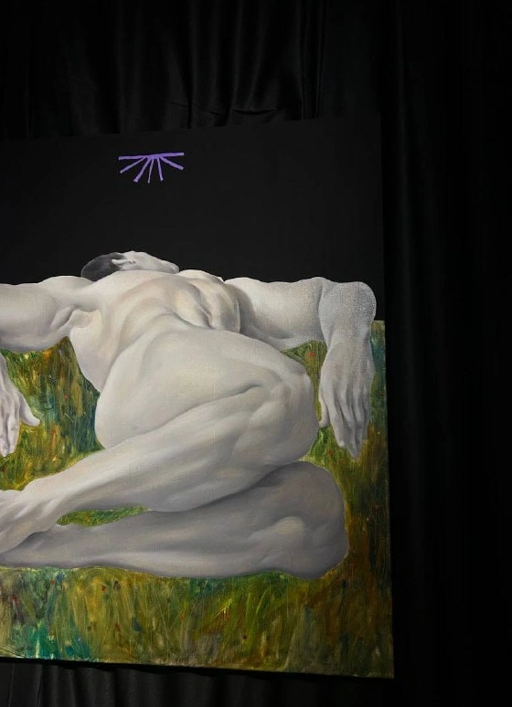 Художник определяет новую серию работ как эксперимент и условный «шаг назад» к реализму — осознанный жест внутри собственной практики. Обычно монохромная живопись приобретает едва заметные теплые оттенки кожи, а фрагменты пространства вырывают фигуры из пустоты холста.