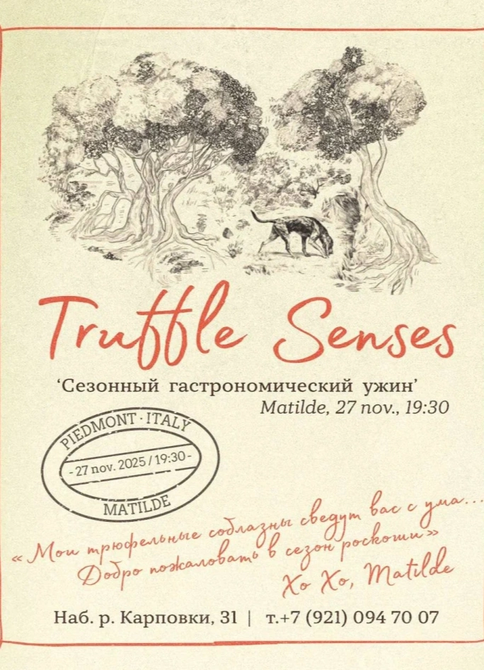 Шеф-сомелье Регина Халикова подберёт вина из ключевых аппелласьонов Пьемонта, чтобы подчеркнуть глубину каждого блюда. Вечер дополнит ароматическая композиция от парфюмерного эксперта Анастасии Козловой, созданная специально для Matilde: она проведёт гостей через тонкие грани трюфельного аромата — от земли после дождя до утренних туманов Альбы.