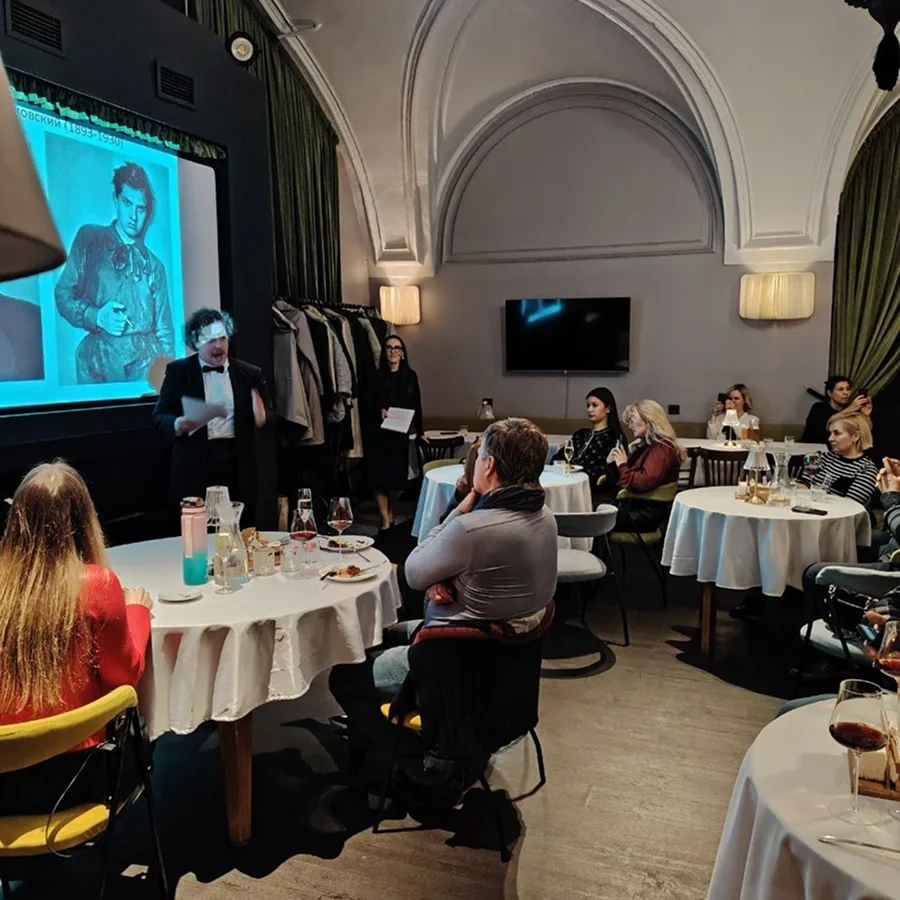 В атмосферном зале киностудии Лендок проведёшь вечер с экскурсом в поэзию Серебряного века через еду и попробуешь 4 курса, каждый из которых — прямое или метафорическое олицетворение конкретного стихотворения или всего творчества знакового поэта той эпохи.