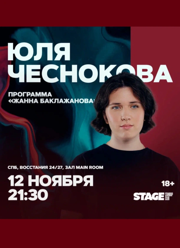 Юлия Чеснокова — стендап-комик с абсурдистским юмором, необычными историями из жизни и провокационными шутками.