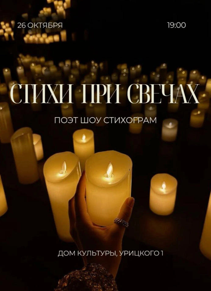 Октябрьский сумрак вечера, камерный зал, мягкий полумрак и десятки мерцающих свечей. Авторская музыка и стихи в исполнении самих поэтов и актёров. В завершении вечера — открытый микрофон, где каждый сможет выйти на сцену и поделиться творчеством.