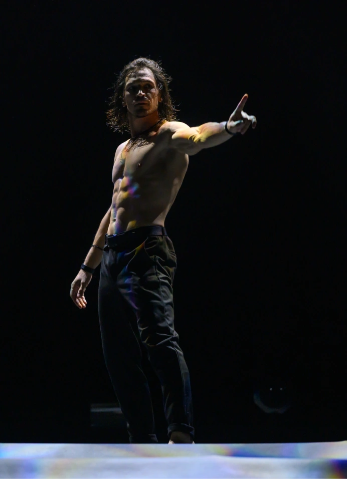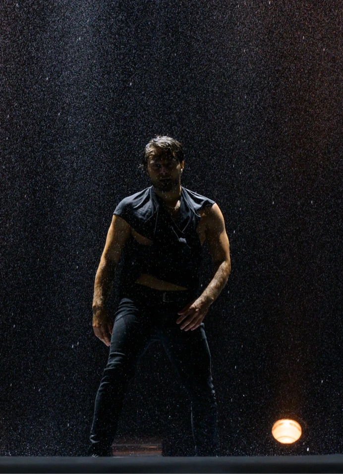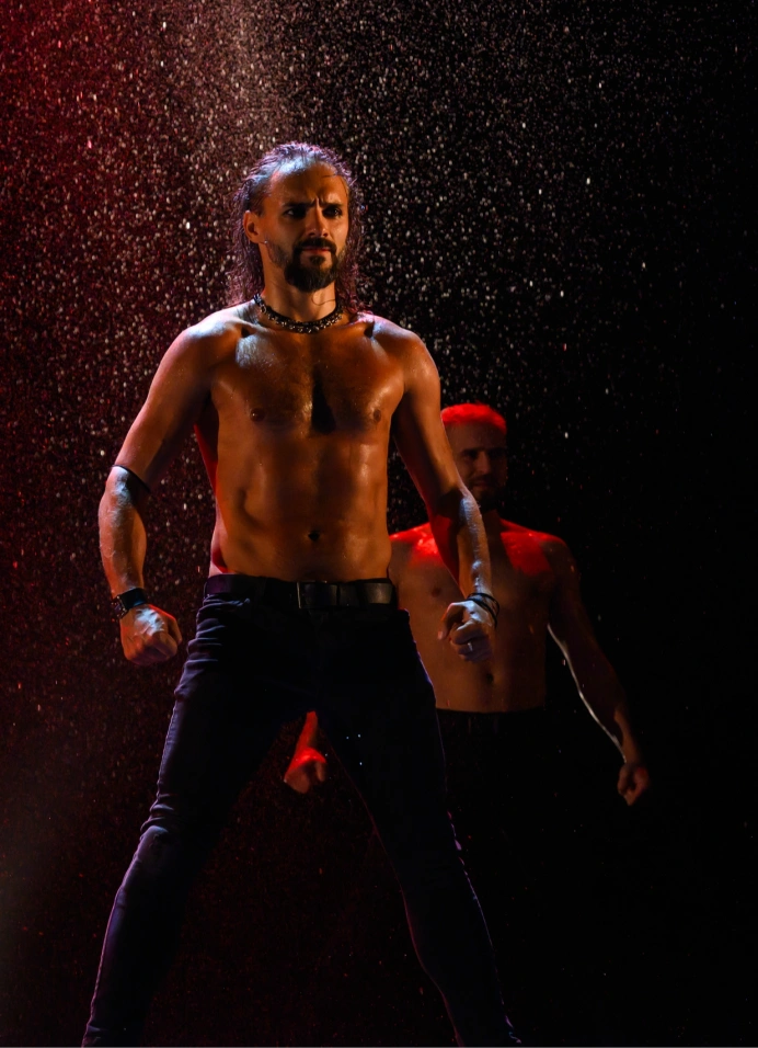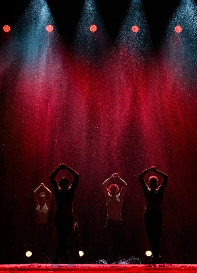 Пластический спектакль под потоками воды, где актёры — мужчины с голым торсом.