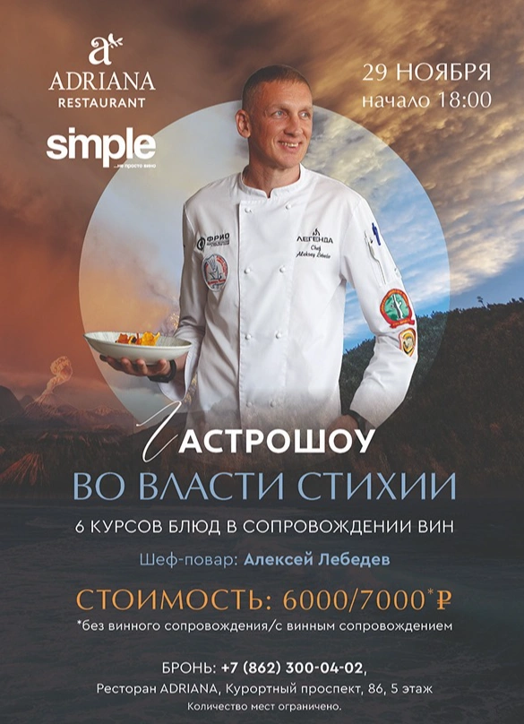 Авторский ужин от Алексея Лебедева, на котором будут представлены шесть курсов изысканных блюд, вдохновлённых мощью и поэзией четырёх стихий — Земли, Воды, Огня и Воздуха.