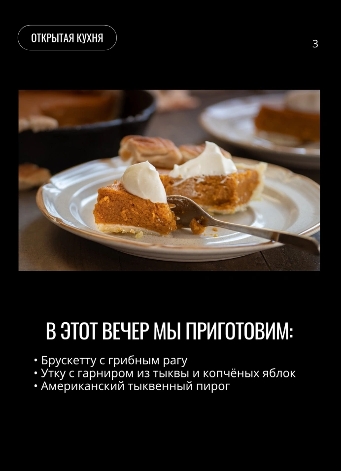 В меню: брускетта с грибным рагу, утка с гарниром из тыквы и копчёных яблок, американский тыквенный пирог.