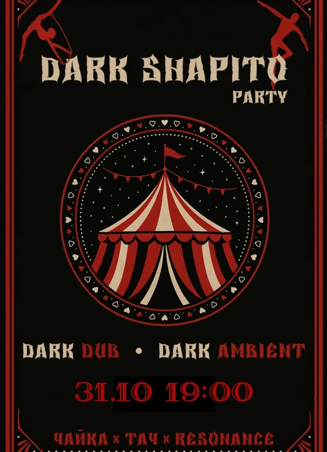— Шатер цирка с line up в стиле Dark Dub/Dark Ambient и акробатами. Line Up: X.el, inyourmind, amnotone x ТАЧ (live), ssympho, Ultrastructura