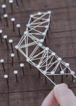 Процесс создания картины начинается с выбора основы, нанесения разметки и вбивания гвоздей в нужные точки. Затем между ними по определённой схеме натягиваются цветные нити. Из этих нитей формируются фигуры, линии и силуэты.